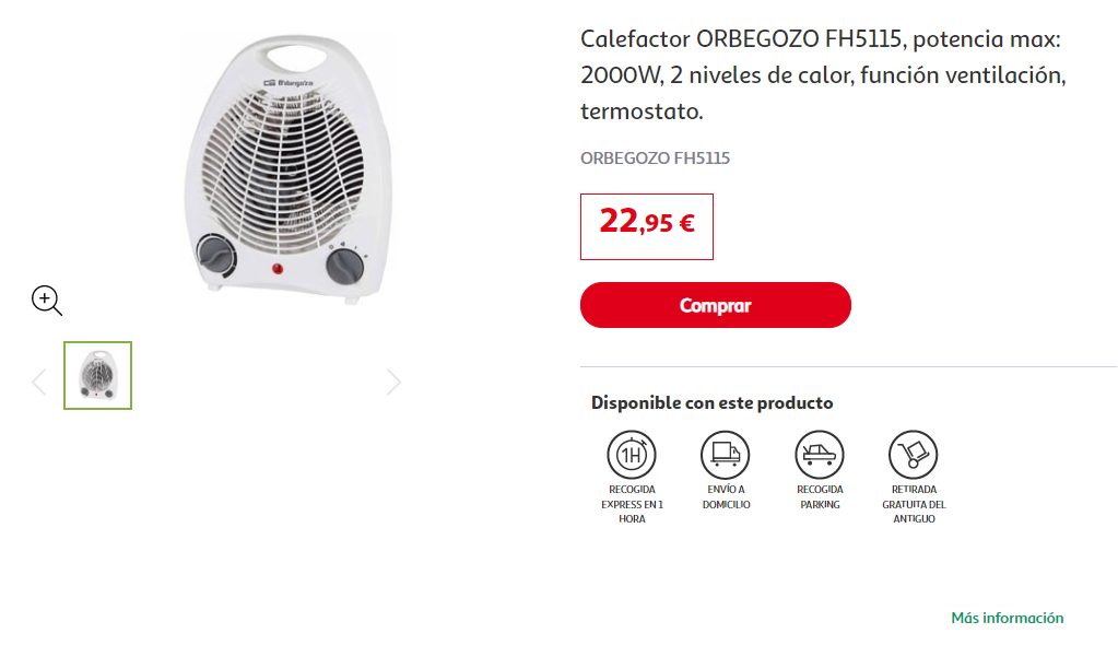 Si quieres tener calor en forma rápida, busca en las tiendas Alcampo el Calefactor ORBEGOZO FH5115, con potencia máxima de 2000 W, 2 niveles de calor, función de ventilación y termostato que puedes ajustar progresivamente y también viene con una función anticongelante.