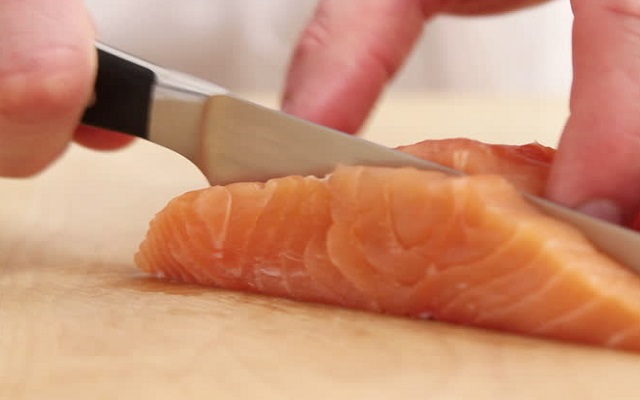 Para preparar el salmón conviene utilizar un cuchillo muy bien afilado, de lo contrario, el pescado quedará demasiado machacado y perderá su textura óptima. Lo picamos finamente, primero en filetes, luego en delgadas tiras y después cortamos cada tira en pequeños trozos. Un truco para facilitar la tarea es que el salmón esté todavía ligeramente congelado. Sin embargo, si se usa un buen cuchillo, no es necesario para que el corte sea perfecto.
