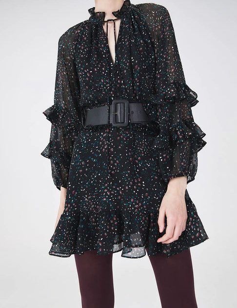 Si te gustan los vestidos de fiesta que te puedas poner también en ocasiones menos formales, puedes elegir este otro también de la marca Sfera, corto, juvenil, alegre y muy original. Es de poliéster de un tejido floreado sobre fondo negro, y cuenta con volantes en el bajo, en la cintura, en las mangas y en el cuello. La manga es larga y un poco abullonada y el cuello tiene forma de pico y se completa con una lazada. Lo tienes en El Corte Inglés por 39,99€. Este es el enlace.