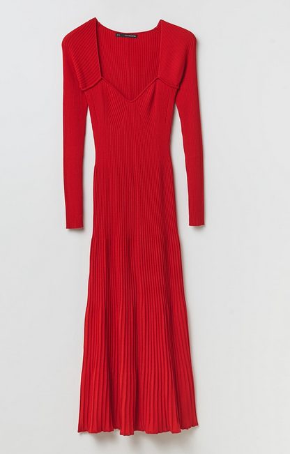 Este vestido es de esos que resultan perfectos en eventos especiales y que a la vez, combinados con otras prendas, se pueden utilizar también en situaciones menos formales. Es de la marca Sfera, hecho de punto con un tejido de viscosa, poliéster y nylon. Queda ajustado al cuerpo, es cómodo y muy favorecedor, muy largo, con la manga también larga y un bonito y sofisticado escote en forma de corazón. Es de color rojo y en El Corte Inglés cuesta 39,99€. Lo puedes conseguir aquí.