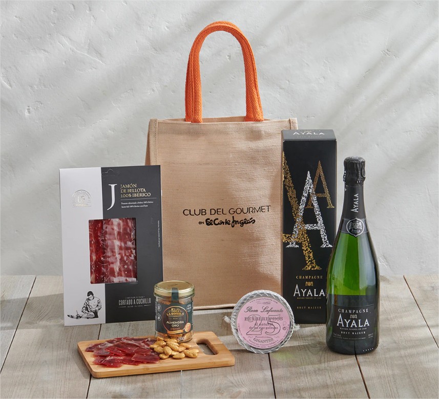 Se trata de una cesta en la que vas a poder encontrar berberechos al natural de las rías gallegas, un tarro de almendras Oro Gourmet Finca la Rosala y jamón de bellota 100% ibérico loncheado. Por último, una botella de Champagne Ayala Brut Majeur Media.