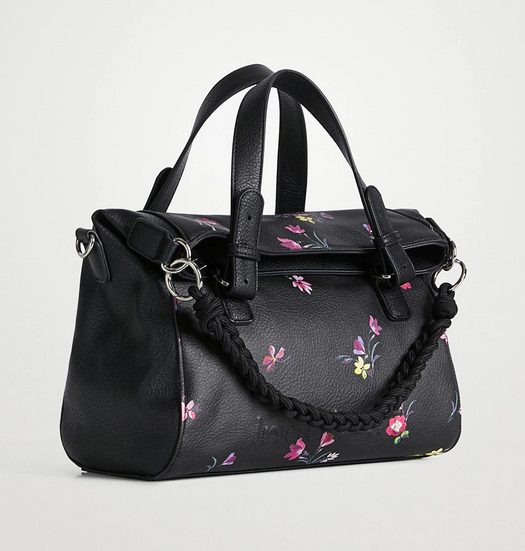 La marca Desigual nos trae este alegre y divertido diseño floreado, ideal para aportar un toque primaveral a cualquier día de invierno. Es un bolso de mano de imitación piel (100% poliuretano), de color negro con pequeñas flores pintadas de colores. Lleva solapa, cierra con cremallera y cuenta con varios bolsillos exteriores e interiores. Lleva un original detalle de cinta trenzada y por dentro lleva un forro en color crudo. Mide 21 (alto) x 29,4 (largo) x 15,8 (ancho) cm y tiene un precio de 69,95€. Lo puedes conseguir en este link.