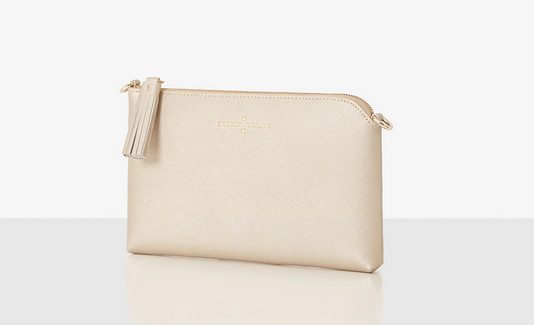 La firma Roberto Verino nos trae otra propuesta para ocasiones especiales. Se trata de un bolso tipo clutch de tamaño mini, confeccionado en piel de un bonito color oro. Cierra con cremallera con un tirador de piel a tono, y lleva una cadena metálica extraíble de 110 cm para llevar al hombro. El complemento perfecto para tus mejores galas por 62€. Si te gusta lo puedes adquirir en este enlace.
