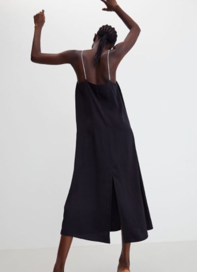 Vamos con este diseño con estilo lencero, que ya sabes que es una de las tendencias más fuertes. Realizado en satén fluido en color negro con tirantes hechos con strass brillante, tiene un escote en pico. Todo además de un bajo que es de corte recto y que tiene una abertura por detrás. Su precio es de 24,99 euros.
