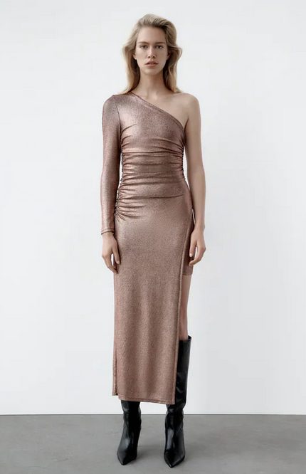 Por último otro vestido ideal para celebrar la Noche buena es este modelo en un fantástico color bronce, con brillos con el que no pasarás desapercibida. Tiene el escote asimétrico con una manga larga. Lleva un detalle de frunces en un lateral en la cintura y es ajustado, con una larguísima abertura lateral y un bajo asimétrico muy original. Combinado con botas, botines o zapatos de tacón. Su precio es de 39,95€.