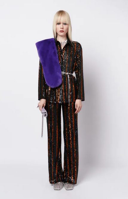 Otra opción con pantalón es este bonito conjunto repleto de lentejuelas de colores brillantes de arriba a abajo. La parte de arriba es una camisa de manga larga y cuello de solapa con cierre de botones. Cuesta 39,95€ y se combina con un pantalón flare a juego, también con aplicaciones de lentejuelas y con el bajo en forma evasé. Cierra con botón y cremallera y un gancho metálico, y es de tiro alto, muy favorecedor, y se vende por el mismo precio que la camisa.