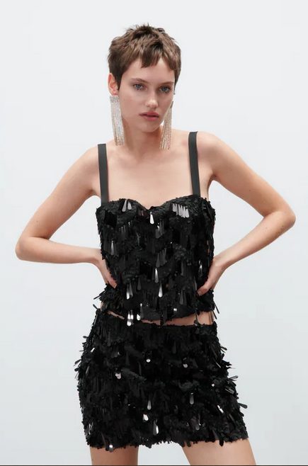 Si lo que te apetece es lucir piernas esta Nochevieja, considera este fantástico conjunto con el que brillarás toda la noche. Se compone de un top corto con tirantes anchos y escote recto con aplicaciones de lentejuelas combinadas a tono. Cierra en el lateral con una cremallera camuflada en la costura y su precio es de 19,95€. Se combina con una falda corta de tiro alto, ajustada y muy favorecedora, con cierre lateral y decorada con lentejuelas, a juego con la parte de arriba. Cuesta 25,95€. También hay una opción de falda midi con el mismo diseño.