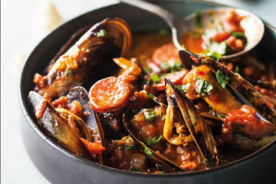 Cubrir el pan frito con mejillones caldosos, judías y tomates lo convierte en una abundante cena de cuchillo y tenedor. Es una receta de mejillones realmente satisfactoria que utiliza un poco de chorizo español muy sabroso para darle un sabor profundo. Por lo que, no deben de perder la ocasión de prepararla en esta época de navidad.