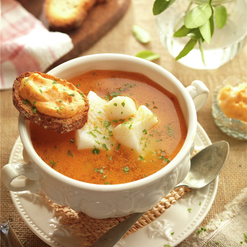 7Bullabesa de Tomate de Verano con Rouille de Albahaca
