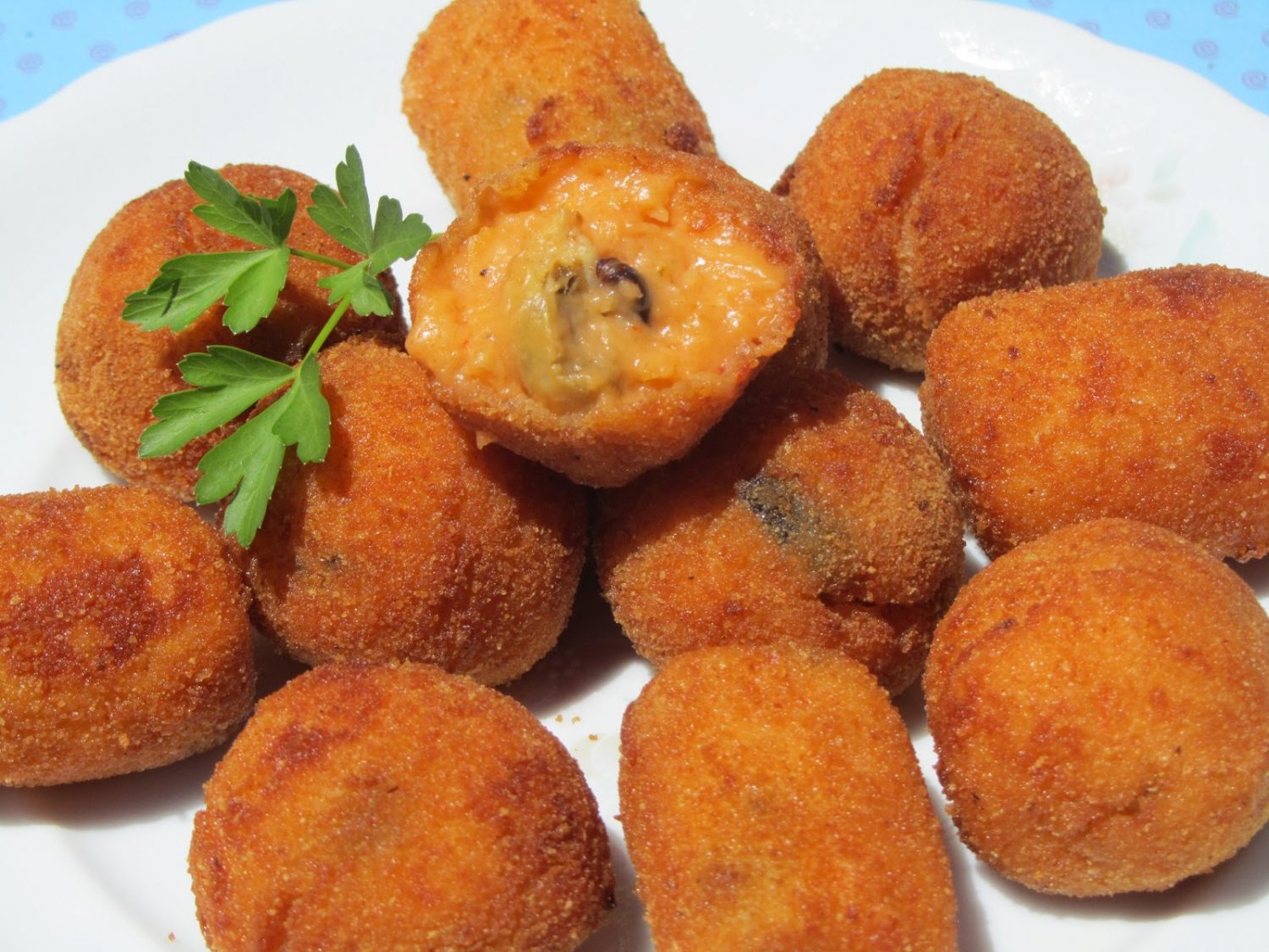 Una vez que se haya derretido la gelatina, incorporamos los chirriones, las gambas y la tinta de calamar. Removemos bien, y añadimos en último lugar el mejillón troceado. Mezclamos con una cuchara de madera y probamos el punto de sal, añadiendo una pizca más si fuese necesario. Después lo dejamos cocer todo durante unos 10 minutos más. Ya tememos lista nuestra masa para las croquetas. Lo siguiente es colocar la mezcla en una fuente y taparla con film transparente para que no se reseque. La dejaremos enfriar a temperatura ambiente y posteriormente la dejaremos reposar en la nevera como mínimo 8 horas.