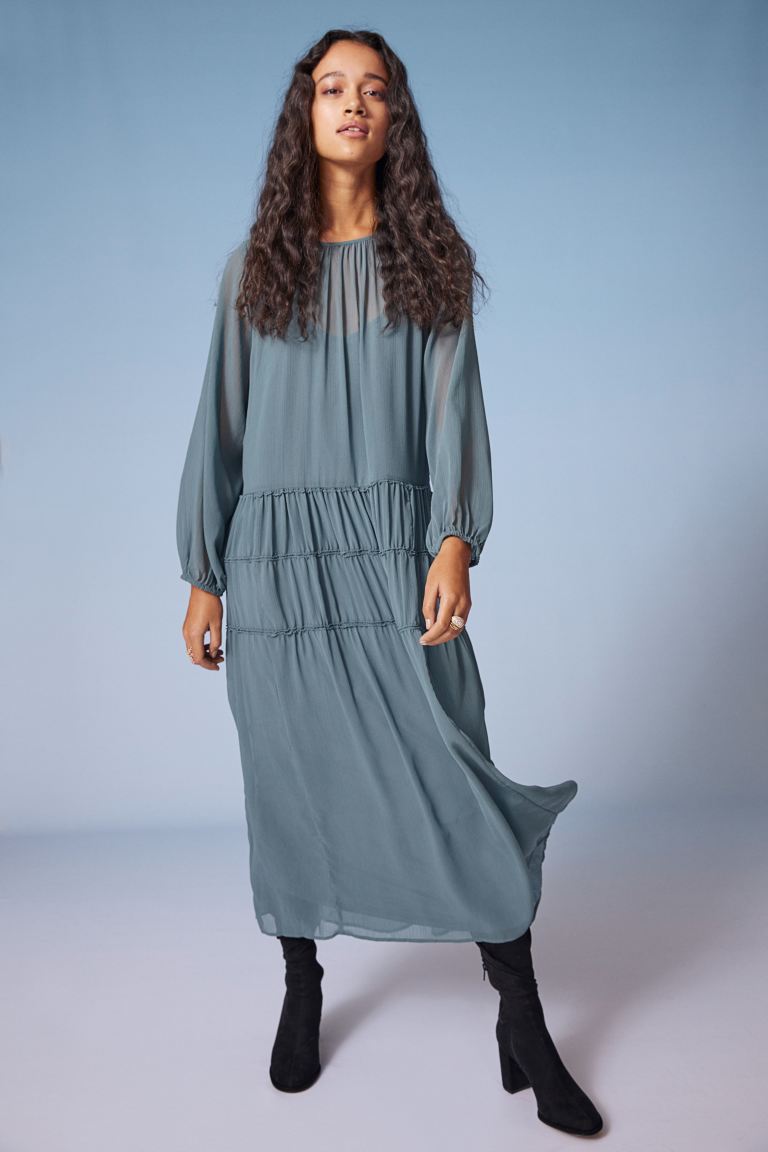 Si alguna vez has pensado que los vestidos de gasa o vaporosos son cosa del verano y no te has planteado usarlos en invierno, seguro que consigues cambiar de percepción cuando veas este bonito vestido, elaborado en dicho material, que podemos encontrar en H&M en tonos tan atractivos como este azul petróleo. En cuanto a su precio, te saldrá por 39,99 euros y también podrás elegirlo en negro.