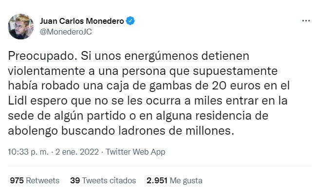 Otro tuitero defendió directamente la actuación ciudadana en el aparcamiento de Lidl: “Me alegro mucho que la gente se implique y ayude a detener al que delinque”. “No me da ninguna pena. No ha robado pan, arroz o leche. Ha robado gambas. Muchos españoles hacen sacrificios para pagarse esas gambas o ese cordero en Navidad”, argumentaba.
