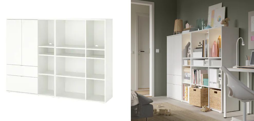 Si buscamos una solución diferente de cara a amueblar nuestro salón, otra de las cosas que más nos pueden gustar es esta combinación de armario y estantería de Ikea. Todo en tonos blancos, le dará a la estancia ese toque nórdico que tanto gusta y será una excelente solución de almacenaje por solo 268 euros.