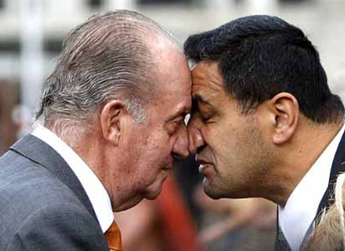 Don Juan Carlos I, padre de la infanta Elena, la infanta Cristina y el rey Felipe VI, también fue protagonista por realizar el saludo amorí a cabezazos. Al igual que marca el protocolo de otras cortes, a su visita a Nueva Zelanda en 2009 se vio obligado a hacer un curioso saludo.
