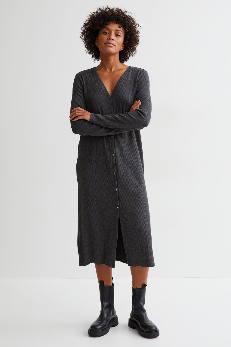 Es un hermoso cárdigan largo en punto de canalé suave con aberturas laterales que pueden usar en cualquier momento del día. Además, es uno de los modelos de hombros caídos con escote de pico. Inclusive, cuenta con un cierre de botones y hombros caídos para generar esa elegancia en esta hermosa prenda. Entonces, si desean comprar esta prenda solo tienen que entrar a H&M por un precio de 10,99 €.