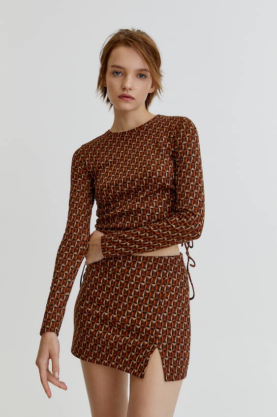 En color marrón con estampado geométrico, con una sutil abertura en su parte central. Deja que todas las miradas se dirijan hacia ti, modelando con delicadeza esta prenda de vestir. Puedes hacerla tuya por solo 7.99 euros.