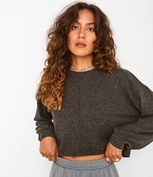 La moda de los tops estilo cropped sigue marcando tendencia, incluso en prendas de más abrigo. La marca Noisy May nos propone este top fluido muy estiloso, juvenil y confortable de manga larga y en color gris oscuro efecto tye dye.