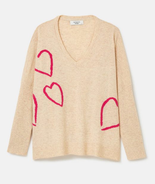 Dale un toque divertido a tus estilismos diarios con este bonito jersey de manga larga y cuello pico, fluido y con movimiento gracias a dos aberturas laterales. Las terminaciones son de canalé y tiene varios dibujos de corazones en trazos a contraste.