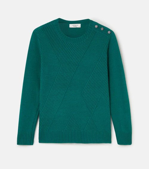 Otra propuesta de la marca Woman es este bonito jersey de punto trabajado que combina diferentes diseños y patrones. Tiene la manga larga y el cuello caja con un detalle de tres botones brillantes en uno de los hombros y terminaciones en canalé. Tiene un corte muy favorecedor y elegante, y resulta perfecto para combinar con cualquier conjunto y aportarle un toque de feminidad y estilo.