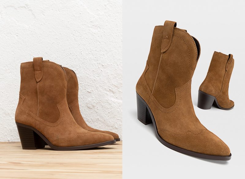 Entre el nuevo calzado de la firma de Inditex están estos botines cowboy de piel, disponibles en color cuero y en beige. Se pueden encontrar en las tiendas de la firma en tallas 35 a 41, siendo su precio de venta de 55,99 euros.