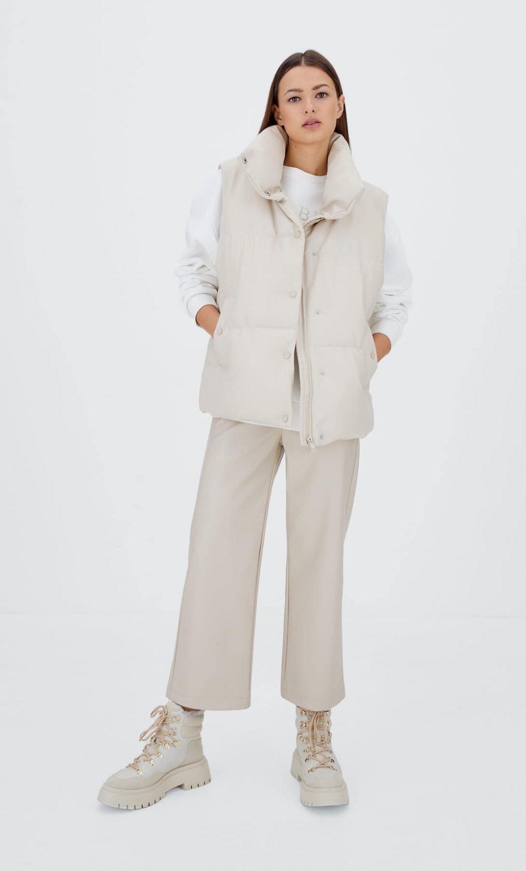 El efecto piel junto a su acolchado le da una vista muy hermosa, con su cuello subido y mangas estilo sisa, con bolsillos en su parte delantera con forro polar. Lúcelo abierto o cerrado dependiendo de la temperatura y la ocasión. En dos colores, crudo y negro y puedes llevarlo por 35,99 euros.