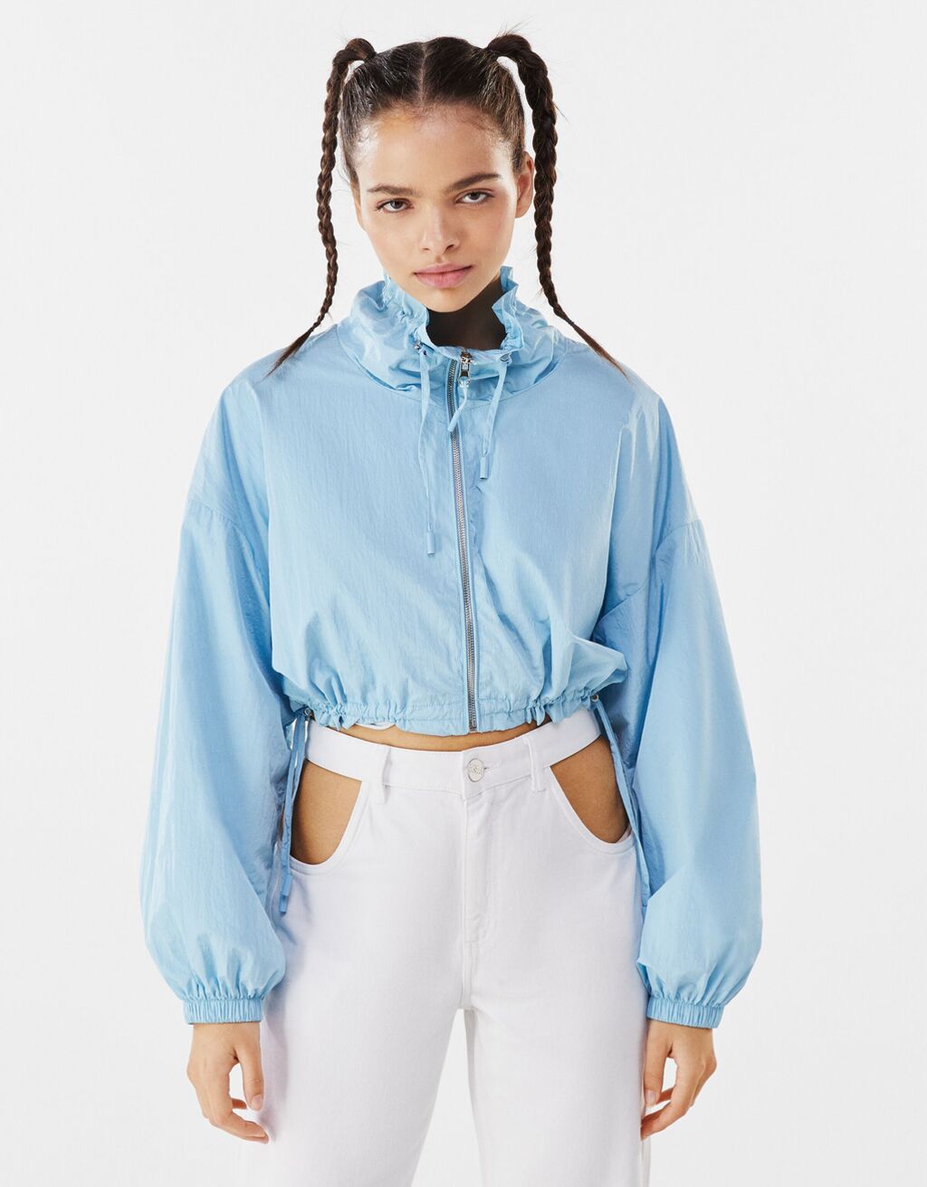 En tamaño corto, mangas largas, con puños ajustados con elásticas, cierre de cremallera y cuello alto ajustable con cordones del mismo color de la cazadora. Ideal para combinar cualquier conjunto de pantalón y camiseta, en variados colores y aun precio de 9,99 euros.