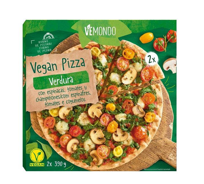También de la marca Vemondo podemos encontrarnos con esta pizza de verduras que se encuentra en la sección de refrigerados y no tiene nada que envidiar a otras versiones de pizza. La masa es fina y está hecha al horno, y lleva espinacas, champiñones y tomates cherry. Es apta para veganos y se comercializa en cajas con dos unidades de 390 gramos cada una. Esta semana está de oferta y cada caja sale a 2,99€.