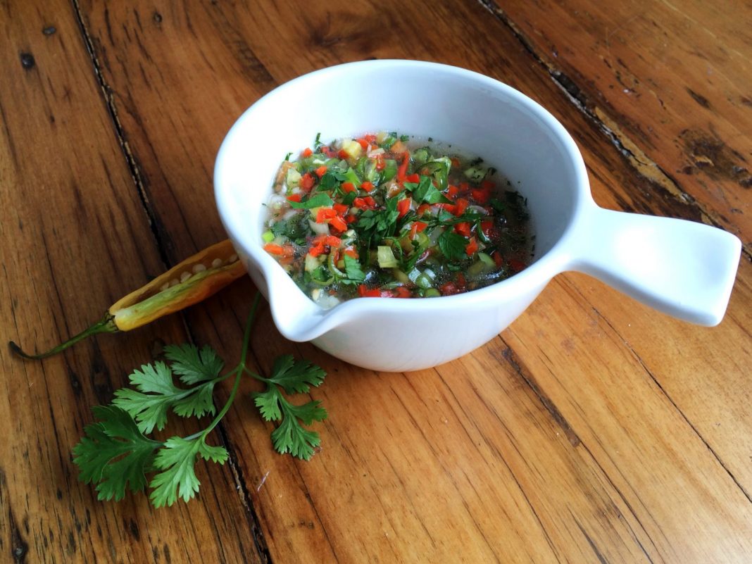 Estas patatas son una delicia tal cual, pero se pueden disfrutar el doble si se acompañan con ají, una salsa tradicional que no suele faltar en las mesas colombianas. Es un condimento muy común similar al pico de gallo mexicano pero con más salsa. Es muy fácil de preparar y le darán un toque mucho más especial a las papas rellenas. A continuación te dejamos los ingredientes.