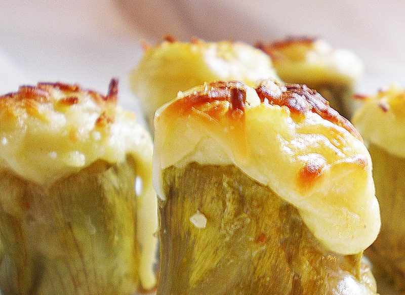 Ahora tendrás que rellenar las alcachofas con el jamón y el queso. Para ello será suficiente con empujar la parte central de la alcachofa hacia abajo. En este paso, reserva algo de queso para su posterior gratinado.