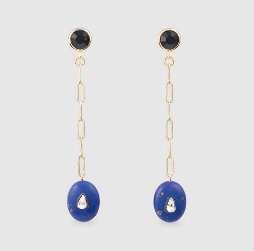 Los pendientes largos son siempre un acierto, especialmente en peinados recogidos o de pelo corto, donde destacan mucho más. En El Corte Inglés puedes hacerte con este original diseño de cadena dorada con botón en negro y detalle de piedra azul con cristal, una combinación de colores llamativa en un diseño elegante ideal para completar todo tipo de estilismos.