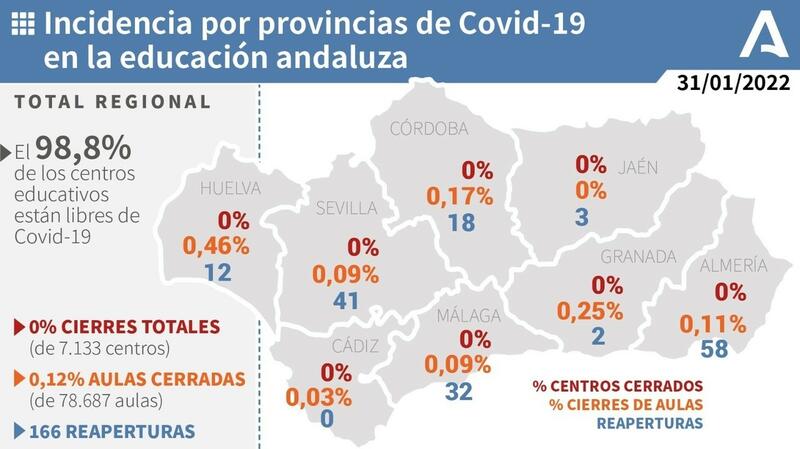 Un total de 308 de los 1.107 centros que se mantienen en seguimiento proactivo en toda Andalucía presenta algún caso positivo en usuarios, lo que supone el 27,9% del total –0,2 puntos menos que el pasado lunes 24 de enero–, de forma que el 72,1% restante está libre de Covid-19 en usuarios. Por su parte, 231 centros contabilizan casos sólo en trabajadores.