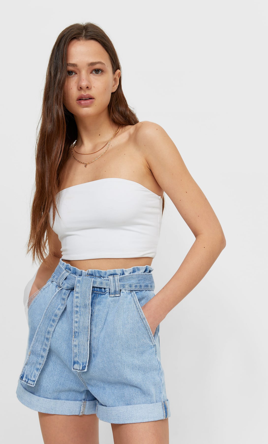 Si pensaste que faltarían los pantalones cortos en Stradivarius, te equivocaste. Busca en cualquiera de sus tiendas este atractivo Short baggy, en tiro alto y su cintura elástica, para que la modeles con tu estilo característico, con su ruedo en vuelta y un delicado cinturón del mimo tejido del short.