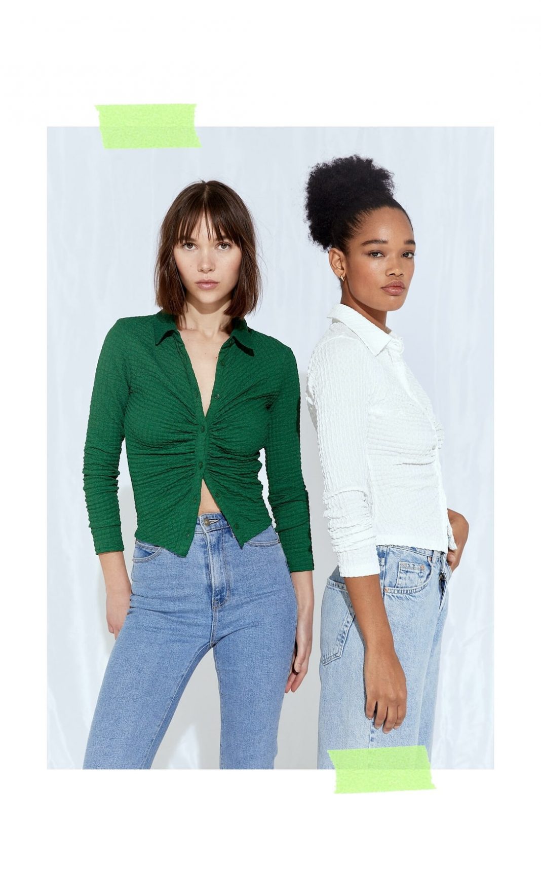La Camisa punto fruncida que tiene para ti Stradivarius en sus tiendas, vienen con un delicado y moderno diseño, con su cuello de solapa y sus mangas largas, cierra en su parte delantera con botones y un vistoso detalle fruncido que resaltara toda tu figura.