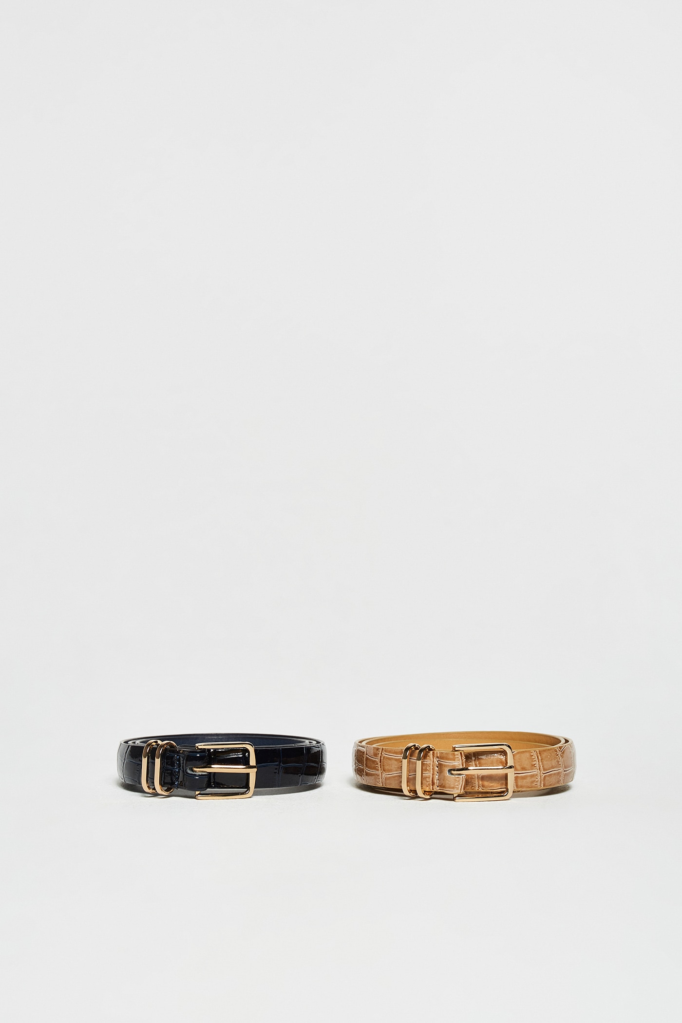 Otra de las promociones que no te puedes perder de las tiendas Sfera, es el Set cinturones acharolados. Una combinación de dos cinturones acharolados con cierre de hebillas doradas.