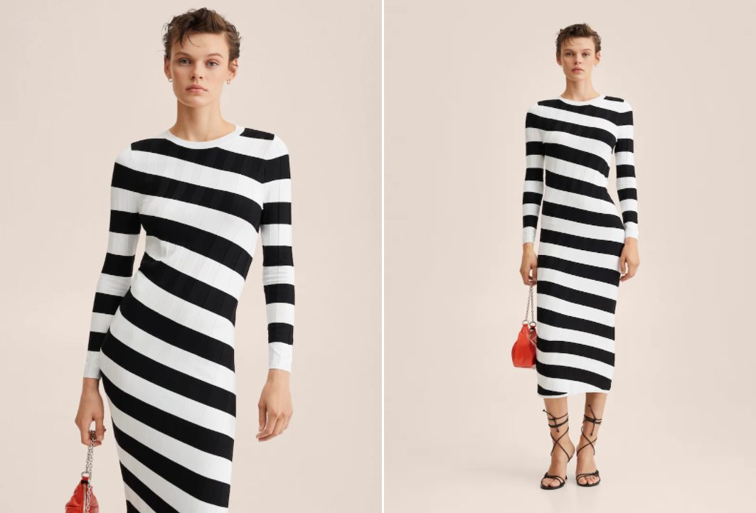 Elaborado en canalé, este vestido largo hasta la pantorrilla será ideal si deseas causar la mejor impresión a través de tu aspecto. De rayas en diagonal blancas y negras, de manga larga y corte de lo más ajustado, será la opción perfecta de cara a llamar la atención en tus citas. Por su precio, de 39,99 euros, será una inversión de la que no te arrepentirás.