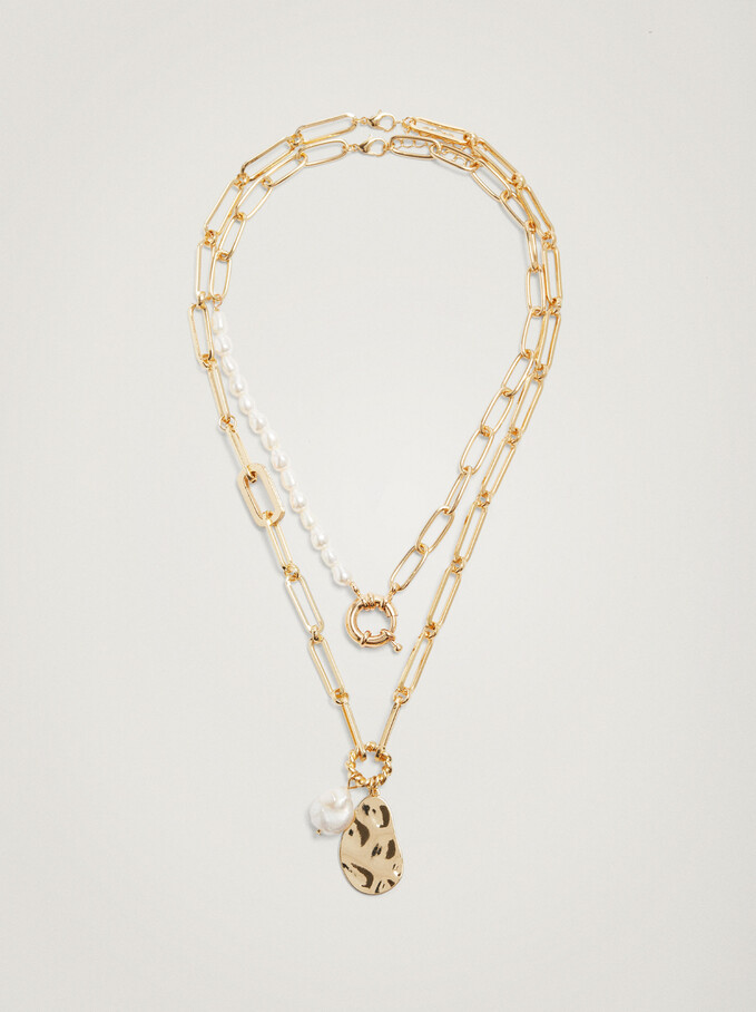Los pendientes debemos saber combinarlos, por eso también encontraras en las tiendas Parfois el Collar corto con perla de agua fresca. Elaborado mediante eslabones metálicos unidos en sus puntas.