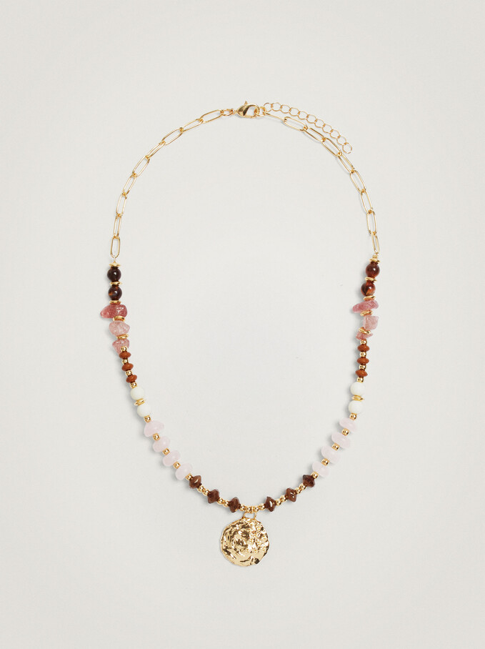 Otra combinación que hará que resalte tu belleza, tiene el Collar corto con abalorios y medalla. Multicolor y elegante, destacara por completo el brillo de tu sonrisa. Por su vistoso y atractivo colorido será muy fácil combinarlo, con algunos de tus pendientes.