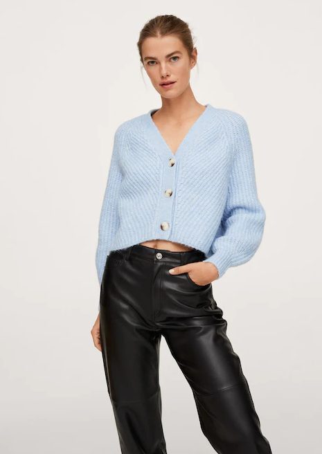 Terminamos el recorrido por una de las tiendas Mango, con este destacado Cárdigan crop punto. Para modelarlo el día que desees destacar tu silueta. Viene en tamaño corto, tejido con puntos gruesos con mezcla de lana, sus mangas largas abullonadas.