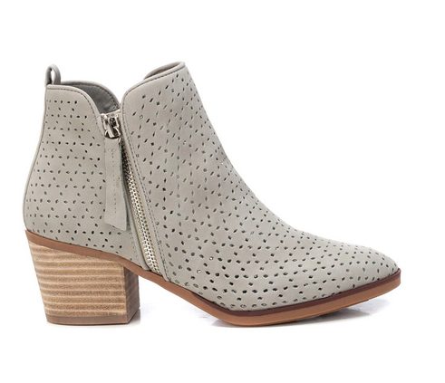 Otros botines llenos de originalidad, son estos de la marca Refresh, fabricados en antelina troquelada, que los convierte en una pieza llamativa e ideal para realzar cualquier look. Cuentan con una cremallera lateral y tienen un bonito tacón de madera de 6 cm de altura con suela de goma antideslizante. Son de color gris claro y cuentan con el certificado vegano de la organización PETA. Tienen un precio de 49,95€ y los puedes conseguir en este enlace.
