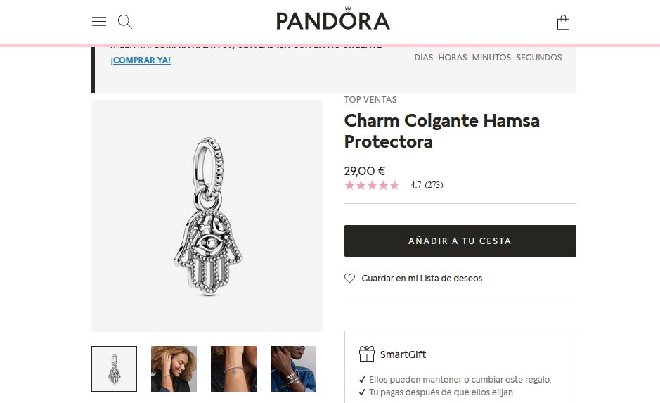 Cuenta con un acabado a mano en plata de primera ley, este charm Hamsa Protectora se presenta con un diseño en filigrana y cuelga de una anilla decorada con esferas. El interior de la joya se presenta decorado con un ojo, rayos y la luna creciente. Inclusive, el borde exterior se ha decorado con esferas haciendo referencia a una de las características de los diseños de Pandora. Para que lo puedan comprar solo tienen que entrar a Pandora por un precio de 29,00 €.