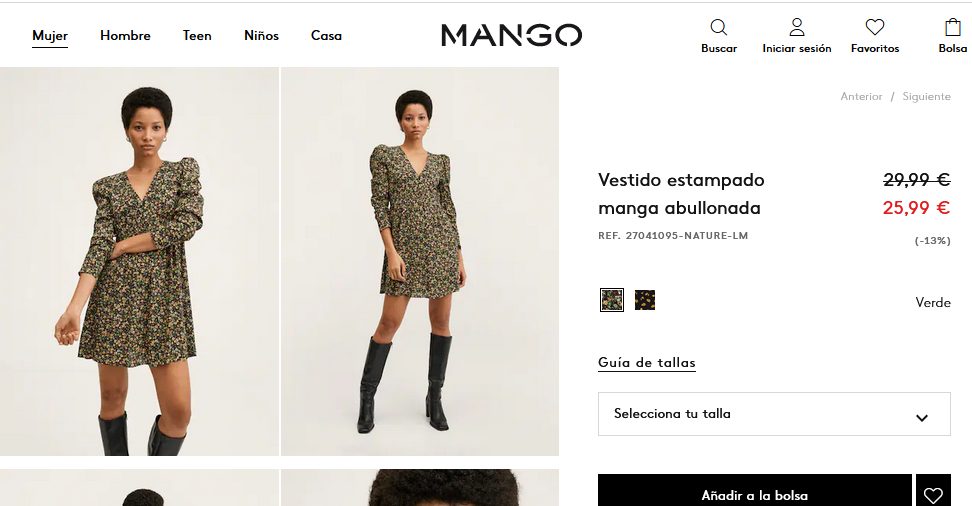 Es un vestido que pertenece también a la colección committed, que cuenta con un cuello pico. Además, es de manga larga, tejido ligero y tiene un solo forro, sin cierre. Inclusive, cuenta con un tejido fluido. Es de diseño corto, evasé y diseño estampado, cuello de pico y de manga larga abullonada. Para que lo pueda comprar solo tienen que entrar a Mango por un precio de 25,99 €.
