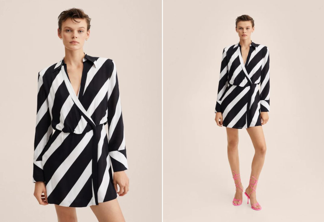 Las rayas parece que se convertirán en el estampado favorito de cara a la próxima temporada y así lo demuestran desde Mango con muchas de sus prendas. Un ejemplo lo tienes en este vestido de corte mini, con estampado de rayas diagonales blancas y negras, de diseño camisero y muy fácil de combinar. Como colofón, cuenta con un precio de 49,99 euros. Irresistible.