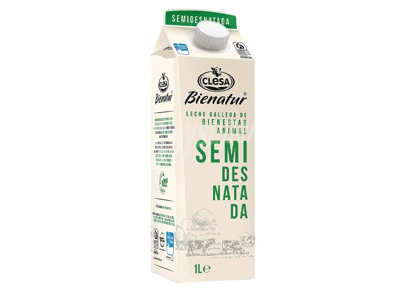 Acercándonos a las mejores leches de supermercado, hay que destacar la leche semidesnatada Clesa Bienatur, una leche gallega de bienestar animal que se vende en un formato de 1 litro por un precio de 0,75 euros.