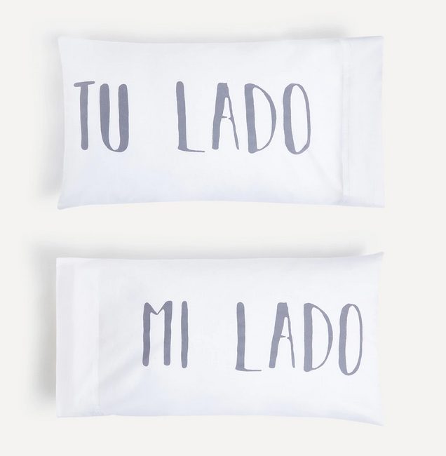 Ideal para regalar si vives en pareja, este juego de fundas de almohada, le dará el toque divertido y romántico a tu dormitorio. Cada pieza tiene un print con una frase: ‘tu lado’, ‘mi lado’, así no hay lugar a dudas en que parte de la cama duerme cada uno. Además de ser originales, está fabricadas en 100% algodón, con un tacto fresco y suave, ya que las fibras naturales son muy transpirables y mantienen la temperatura idónea. Cada pieza mide 50x85cm, son de color blanco y cuestan 8,95€. Puedes conseguirlas aquí.