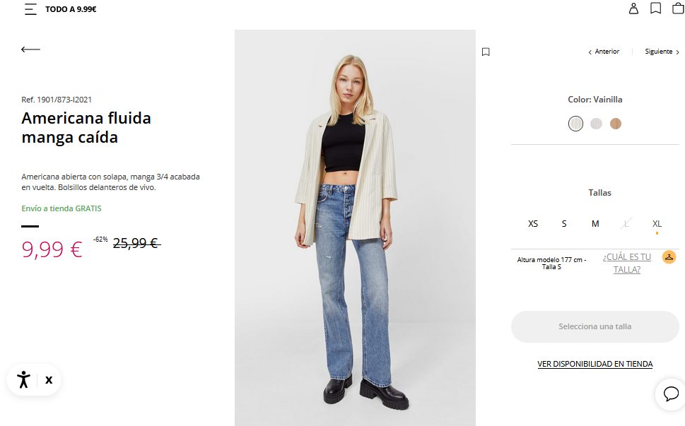 La americana abierta con solapa es una de las prendas de vestir más solicitadas en esta temporada de rebajas. Además, cuenta con manga 3/4 acabada en vuelta para un mejor estilo en todo momento. Inclusive, cuenta con unos bolsillos delanteros de vivo para hacerla única dentro de las demás prendas. Para que la puedan comprar solo deben entrar a Stradivarius por 9,99 €.