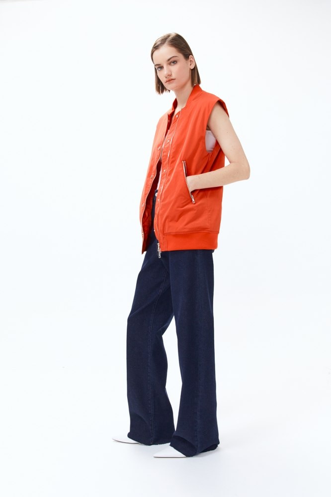 Esta bomber sin mangas quizá sea una de las prendas más originales disponibles en el actual catálogo de Sfera. A modo de chaleco, resulta llamativa además por su intenso tono naranja, uno de los más favorecedores. Perfecta para crear looks distintos y con fuerza, puede ser tuya por 39,99 euros.