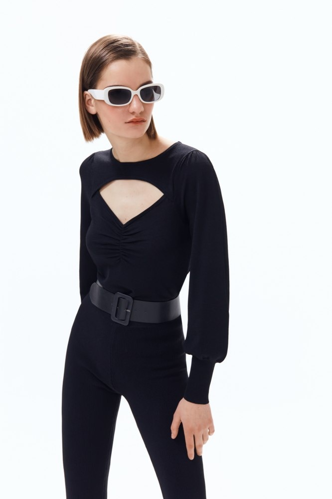 Los jerséis cut out los empezamos a ver hace algunas temporadas y parece que esta primavera continuarán pisando fuerte en las tiendas de moda. En este caso, elegimos este, con manga abullonada y un intenso tono negro, abierto en la parte del pecho dando un aspecto muy elegante. Disponible por solo 19,99 euros, será una gran inversión.