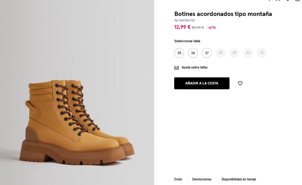 Son uno botines de color de mostaza que cuenta con una altura del tacón de 5cm y plataforma de 3cm. Además, los botines son acordonados tipo montaña en color mostaza para un mejor estilo. Inclusive, cuenta con unos detalles de acolchados y una suela con track para una mejor comodidad. Para que puedan comprar estos hermosos botines solo deben entrar a Bershka por 12,99 €.