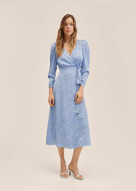 Para cualquier noche de gala o alguna ocasión muy especial, podrás modelar tu figura con este delicado Vestido cruzado estampado, que encontraras en alguna de las tiendas Mango. En tejido satinado, mangas largas y tamaño largo.