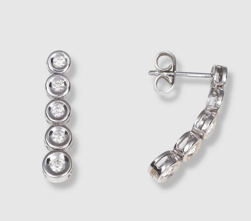 Volviendo a los diamantes auténticos, esta vez en forma de pendientes, la reconocida marca de joyas Luzz nos ofrece en su catálogo estos exquisitos pendientes largos de oro blanco de 750 milésimas, en un color plateado brillante, con una línea de diamantes de 0,36 kt, calidad H-VS y cierre de presión.